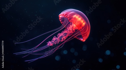 © pupus, Fototapeta premium A Glowing Red Jellyfish Swimming In The Dark Ocean Water