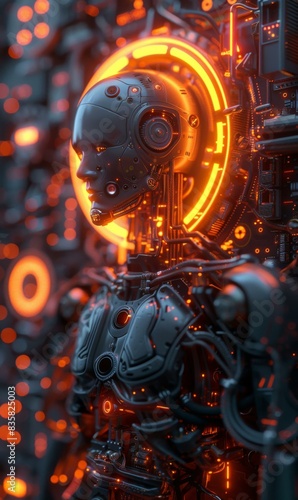 © sergio, Fototapeta premium A glowing robot stands in a dark room. AI.