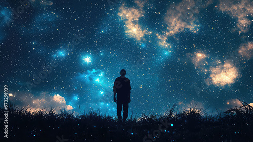 Obraz premium A glowing silhouette of person standing under starry sky, feeling awe