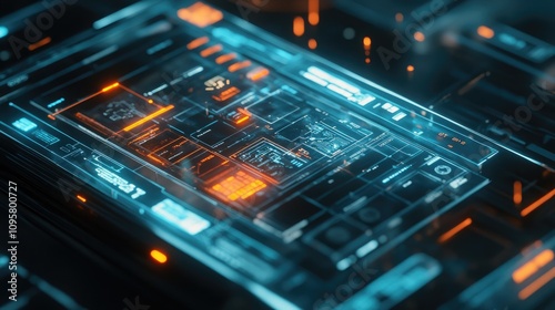 © Natchooda, Obraz premium A glowing smartphone interface showcasing a modern business application with holographic elements and mesh-like digital lines