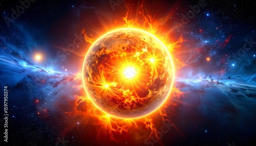 Obraz premium A glowing sun surrounded by a fiery nebula in deep space, creating a dramatic...