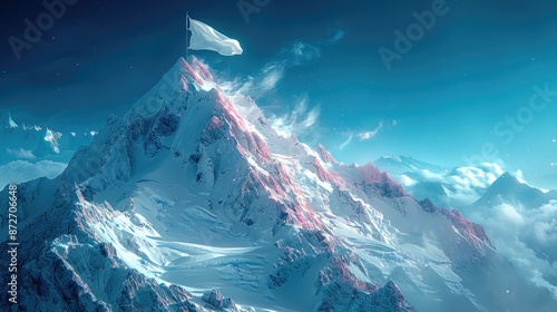© Алина Бузунова, Fototapeta premium A glowing white flag atop an mountain peak, symbolizing achievement and victory