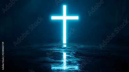 © simba kim, Naklejka premium A glowing white neon cross centered on a pitch-black background, Generative AI