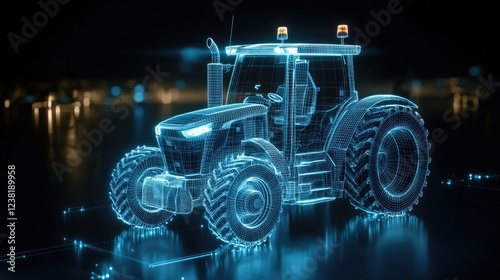 © lililia, Fototapeta premium A glowing wireframe tractor reveals intricate electronics against a dark blue backdrop, merging technology with agriculture