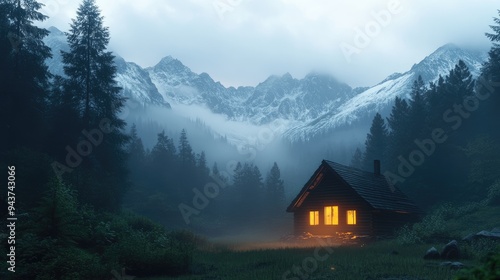 Fototapeta premium A glowing wooden house in the forest, with foggy mountains adding depth to...
