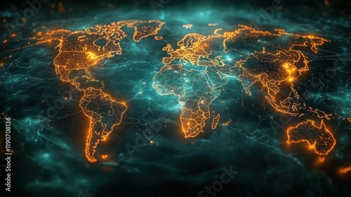 Obraz premium A Glowing World Map on a Dark Background Highlighting Globalization and...