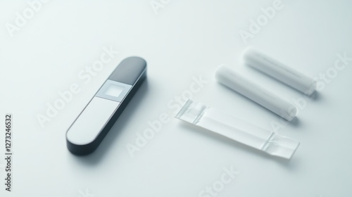 Naklejka premium A glucose meter and test strip laid out neatly on a surface. Featuring health awareness and self-monitoring