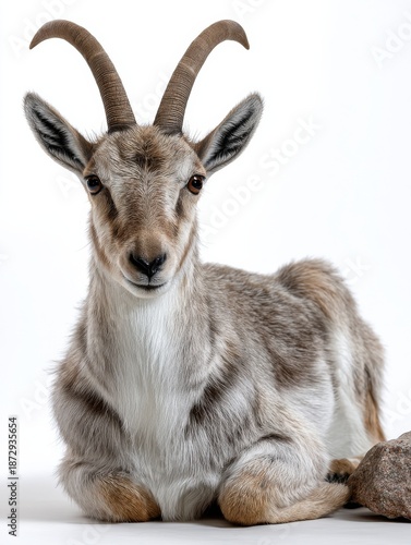 © Mrammon, Fototapeta premium A goat is laying down on a white background