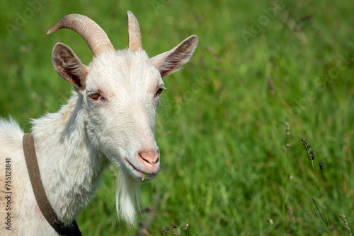 © Andrey, Fototapeta premium A goat is standing in a field in close-up.