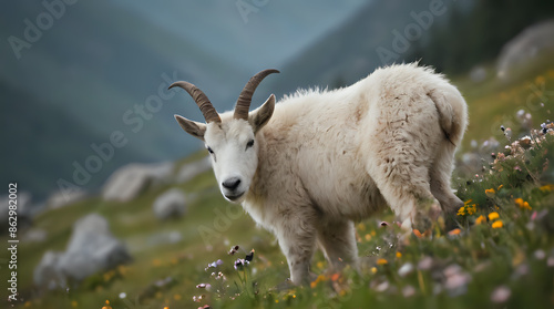 © Masum, Naklejka premium a goat that is standing in the grass with flowers