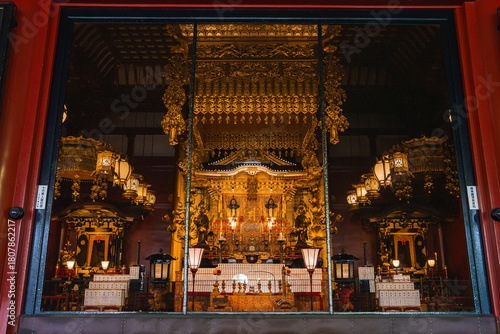 Obraz premium A gold altar glows within a Nara temple, viewed through red pillars. Chandeliers, canopies, and lanterns frame the central shrine in soft daylight, formal and reverent.