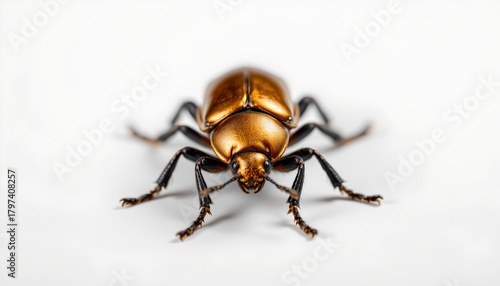 © MakeitEasy, Naklejka premium A gold colored beetle with distinctive wing covers, standing prominently against a plain white background.