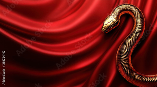 © BOW_NAPASORN, Obraz premium A gold colored snake is curled up on a red cloth. The snake is curled up in a way that it looks like it is sleeping. The red cloth is draped over the snake, making it look like it is resting on a bed