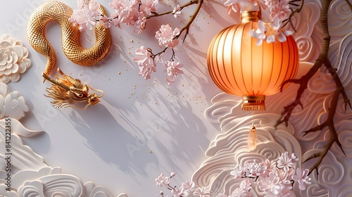 © Lipa, Naklejka premium A gold dragon is on a white background with a pink tree and a lantern. The lantern is orange and is hanging from a branch. The scene is a representation of Chinese culture