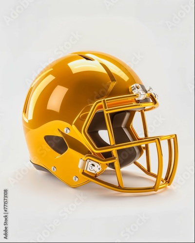 © Pawellpi Design, Fototapeta premium A gold metal football helmet with a black visor and eye cups is displayed on a white background. It has an industrial design style that gives it a high quality look.
