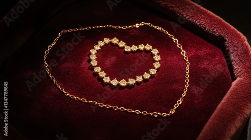 © Sawat, Fototapeta premium A gold necklace arranged in a heart shape on a velvet jewelry pad.