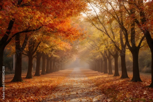 © YiXiong, Fototapeta premium A golden autumn path under a misty sky.