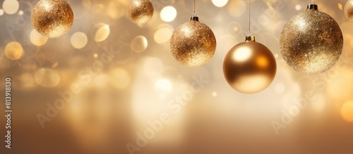 Fototapeta premium A golden bokeh background with copy space is adorned with hanging golden Christmas ball decorations