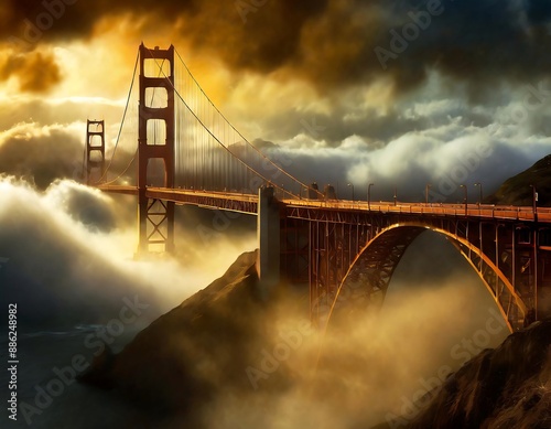 © HORA STUDIO, Fototapeta premium A golden bridge over a foggy night in san francisco