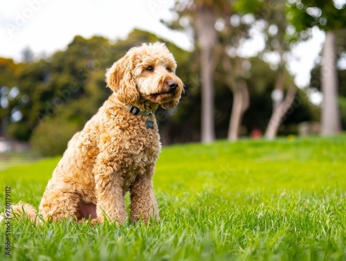 © Worrapol, Fototapeta premium A golden doodle dog sitting on the grass in an outdoor park