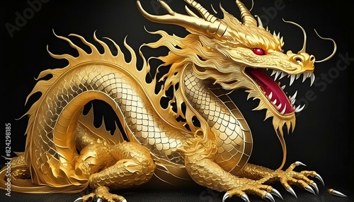 © Mom, Obraz premium A golden dragon isolated on a black background