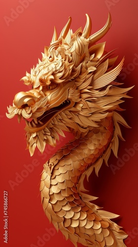 © Denis, Obraz premium a golden dragon statue is hung on a red background