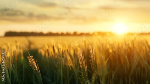 Obraz premium A golden field of crops bathed in the warm light of sunrise, symbolizing nature, growth, and tranquility.