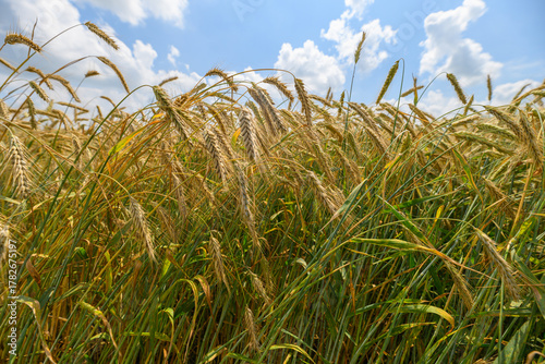 Obraz premium A Golden Field of Wheat Spread Vastly Under a Beautiful and Bright Blue Sky...