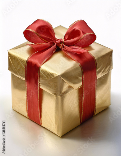 Obraz premium A golden gift box with a red ribbon bow, surrounded by festive decorations....