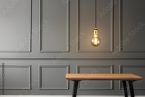 © Usama, Fototapeta premium A golden hanging light bulb shines over an oak table with black legs, against a backdrop of sleek gray walls in a contemporary living space.
