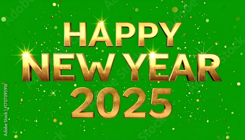 © Amelia, Fototapeta premium A golden "Happy New Year 2025" message with celebratory glitter and sparkles on a vibrant green background