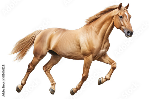 © iridescentstreet, Obraz premium A golden horse galloping gracefully across a bright background in an energetic display of movement and beauty