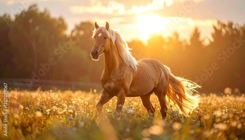 © Amelia, Obraz premium A golden horse gallops freely through a sunlit meadow, mane and tail flowing in the breeze during golden hour