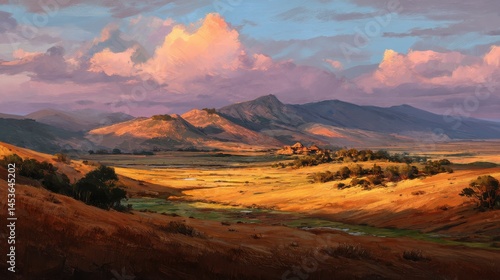© Pisit, Fototapeta premium A golden hour landscape bathes everything in warm light