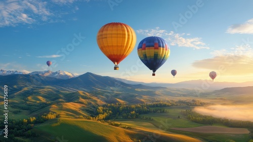© songwut, Fototapeta premium A golden hour photograph of hot air balloons floating above a picturesque valley, with the sun rising in the background.