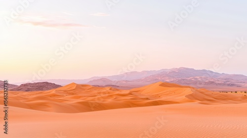 © Preecha, Naklejka premium A golden hour scene of vast sand dunes under a soft gradient sky, creating an elegant backdrop for commercial posters with ample copy space