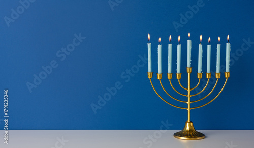 © ActionGP, Obraz premium A golden menorah with nine lit candles sits on a white surface before a deep blue wall, evoking Hanukkah tradition, warmth, and holiday celebration
