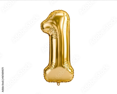 © axmilasky, Fototapeta premium A golden number 1 balloon isolated on a white background in the front view