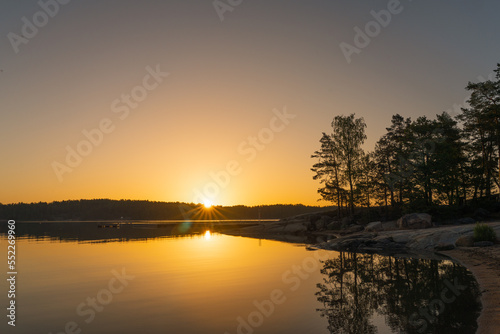 © M.V.schiuma, Fototapeta premium A golden-orange sunset on the sea with a silhouette of a tree line on the horizon. Nature of Finland. Scandinavia. Natural background. Space for text.