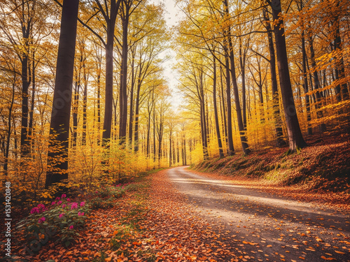 © DH Tree Stock, Obraz premium A Golden Path Through the Autumnal Woods A Symphony of Color and Light Beneath the Canopy in the Quiet Embrace of Nature's Transition A Tapestry of Seasonal Beauty