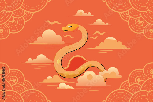 © arisadobe, Obraz premium A golden snake flying in the clouds on a red background with a repeating pattern in the corners.