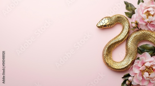 Fototapeta premium A golden snake intertwines with delicate pink flowers against a soft pink...