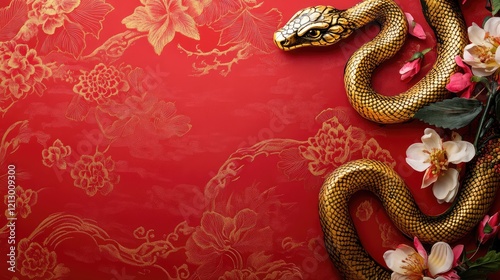 © TommyNa, Obraz premium A golden snake is coiled gracefully among white and pink flowers on a rich red background with intricate gold floral patterns. Perfect for Chinese New Year designs and festive decor