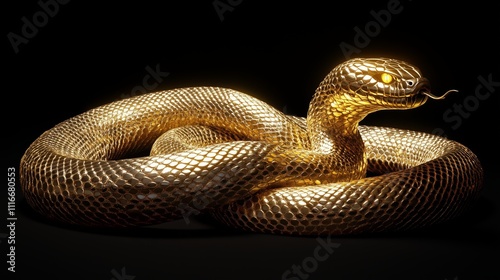 © Ailee Tian, Fototapeta premium A golden snake, made of metal, with its head raised upwards.