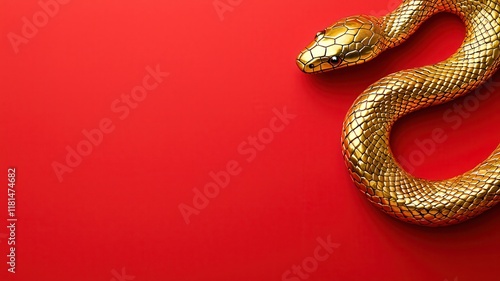 Fototapeta premium A golden snake slithers gracefully across a vibrant red background, creating...
