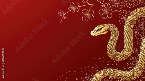 © TommyNa, Obraz premium A golden snake surrounded by cherry blossoms and leaves on the right side of a red background, featuring gold foil outlines and minimalist Chinese New Year design. Perfect for festive cards or banners