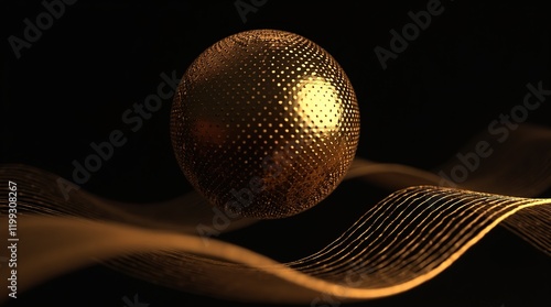Fototapeta premium A golden sphere floats above smooth, wavy lines, set against a dark...