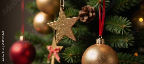 Fototapeta premium A golden star-studded Merry Christmas backdrop with Christmas ornaments