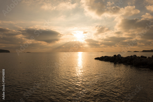 Naklejka premium A golden sunrise in the sea of Ibiza