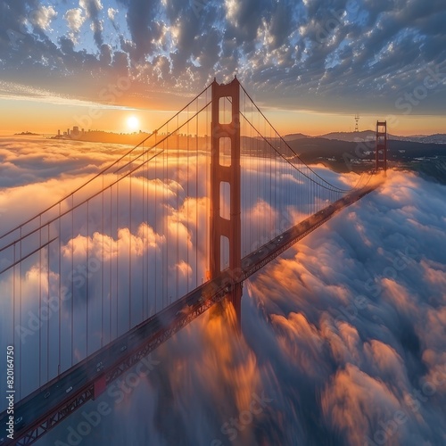 © Fokasu Art, Obraz premium A golden sunrise reveals the iconic Golden Gate Bridge enveloped in morning fog over the water
